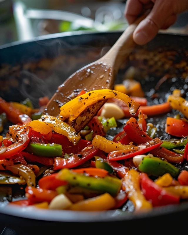 - Add the chopped bell peppers and minced garlic to the skillet, cooking until the peppers are tender.