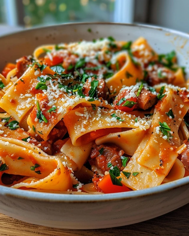 A flavorful twist on traditional drunken noodles, featuring Italian ingredients like sausage and bell peppers.